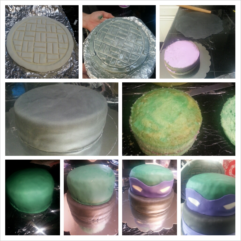 Then, it was a lot of coloring and rolling out fondant, trimming of cake, carefully stacking the delicious goodies. He used a total of four 8″ round cakes (two for the hole, two for Donnie’s head).
