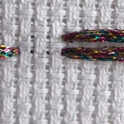 Initial Stitching Thoughts: I had to approach this testing in a different way, as 1/16″ ribbon is a little hard to stitch full crosses on the fabric sizes I have. In fact, Kreinik say (above) to stitch it on 10 or 11count aida only (which unfortunately I don’t have) so to use it to do a full stitch seems unfair for comparison because the thread gets all smushed to try and get through the smaller holed fabric.