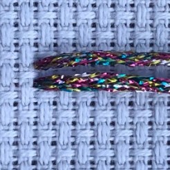 Brand Advice: Rainbow Gallery state the following: “Cross Stitch 14-22 Count. Treasure Braid is a shiny metallic that comes in size #4 and #8. All are braided and will not unravel as you stitch. It is very durable and can be used in longer lengths. It is a soft metallic and covers the canvas well. Size 4 is a good substitute for several plys of blending filament. Size 8 is twice the size of 4. Available in several colors that include High Gloss and Shimmer Colors”.