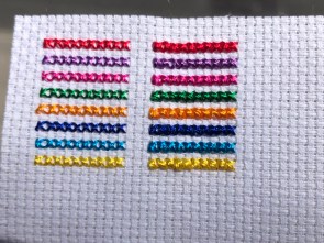 Test Summary: I feel very reassured in using these for accents and highlights within designs and particularly loved single strand use on both white and coloured aida. I would perhaps only use 2 strand on white (or a very light fabric) if I really wanted a punch of pastel colour, as I would find it quite difficult to keep everything looking as neat and uniform as I personally, like. I’d also recommend that the ease of using this could be improved by using a wax product to help with the issues with fraying if encountered.