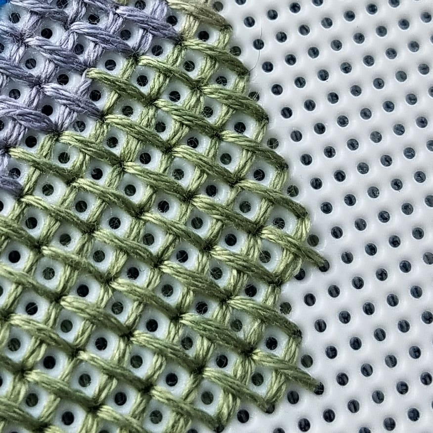 If you’re unfamiliar with what over 2 means, it basically means that I’m stitching over 2 squares (clever name, right?) This helps a lot with quarter stitches because quarter stitches on plastic canvas usually ends up making you cry because you have to use a sharper needle to make a place to create the quarter stitch. Plus, look how cool it is close up!
