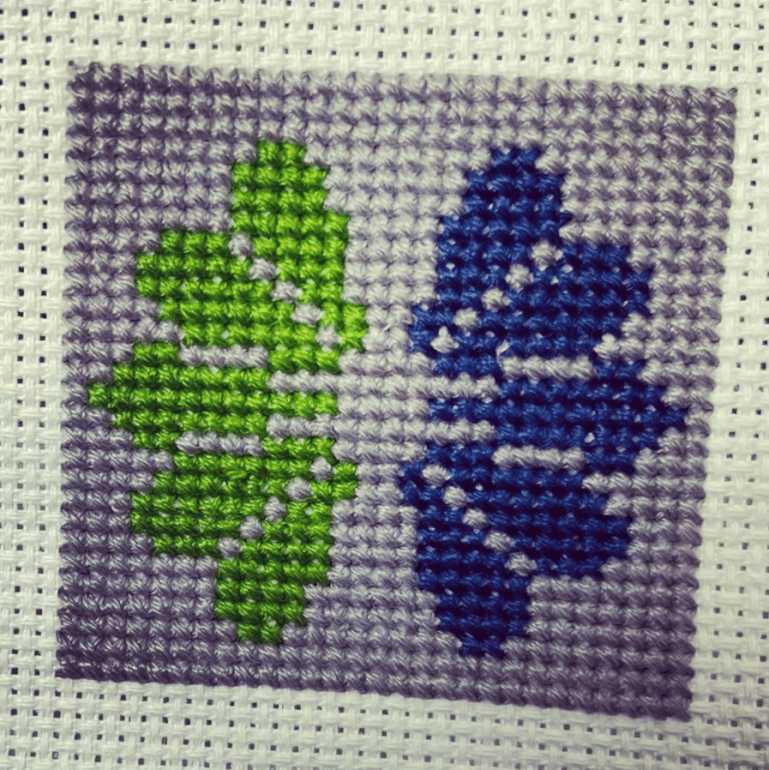 This week is Sign of Opposing Will which players could win by beating the Bungie Bounty team. I never won one but definitely coveted my friends’ emblems! It’s another one that can really be done with many DMC options, but I used 03, 311, and 703. The pattern itself is a nice simple motif that stitches up super quick. (which is probably why it was stitched on time lol)